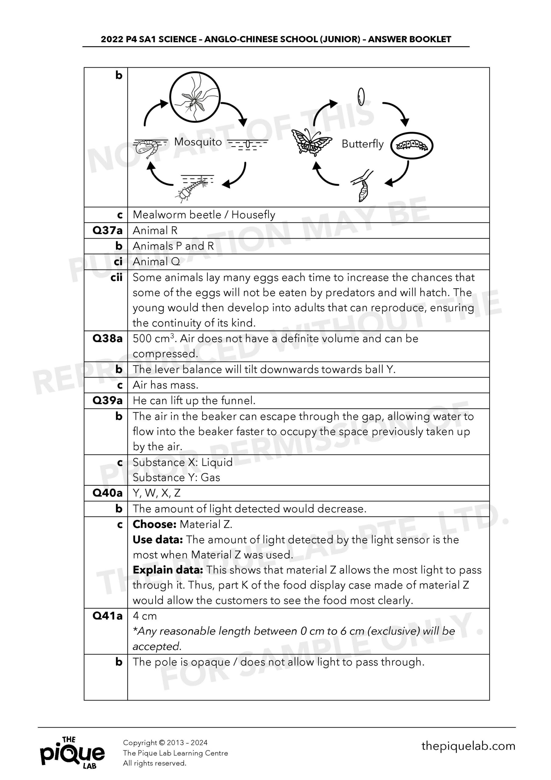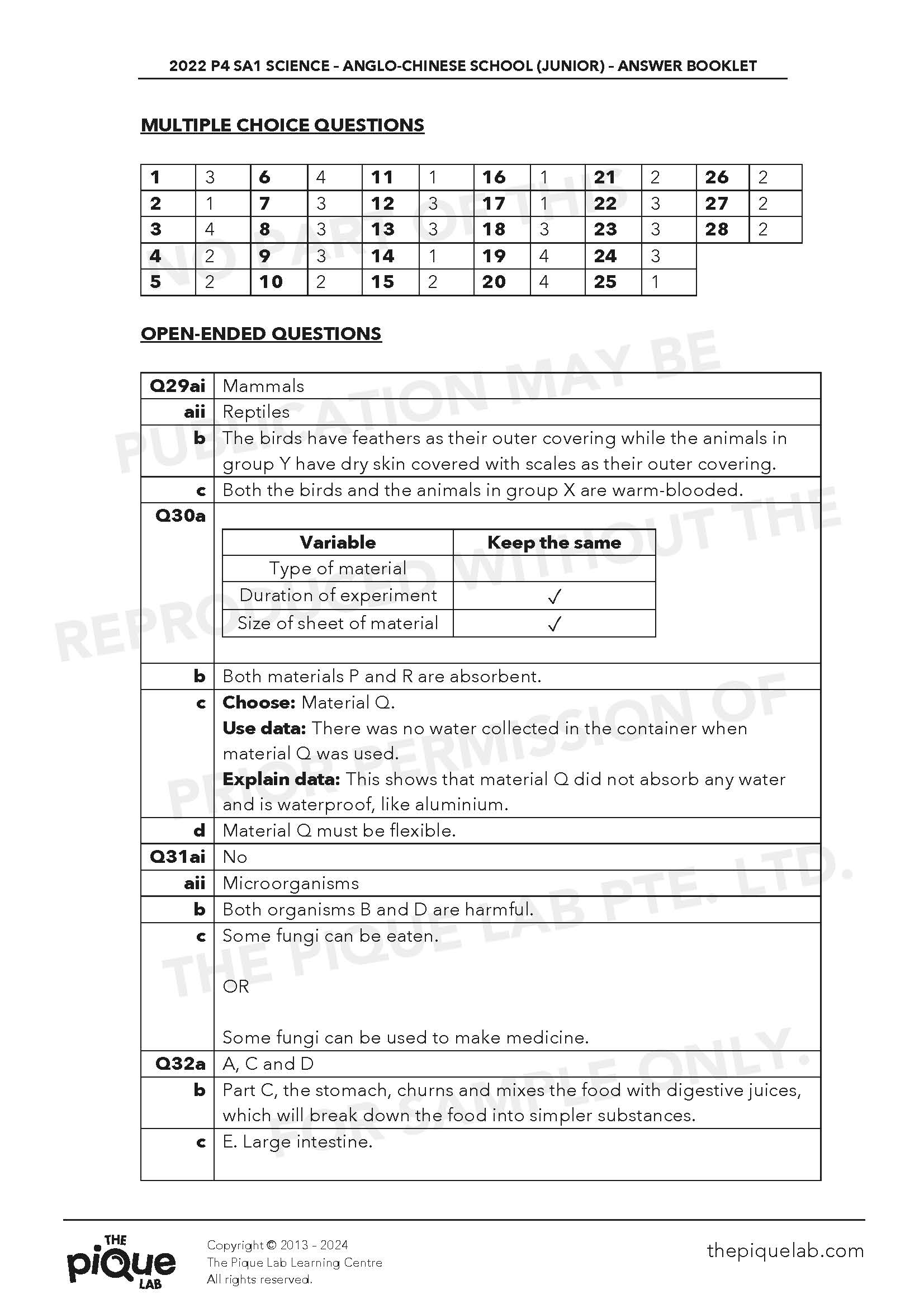 The aforementioned answers should be treated only as a guide. The answers provided may not be entirely representative of the opinions of all primary school Science examination setters in Singapore. The Pique Lab will not be offering any refund/store credit under any circumstance.
